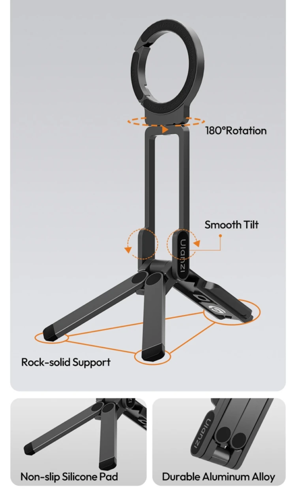 With its strong magnetic grip, your phone stays secure at all times, while the 180° adjustable rotation gives you the perfect viewing or recording angle. It works as a stand, handheld grip, tripod, or hanging mount, making it ideal for video calls, content creation, work, and entertainment.